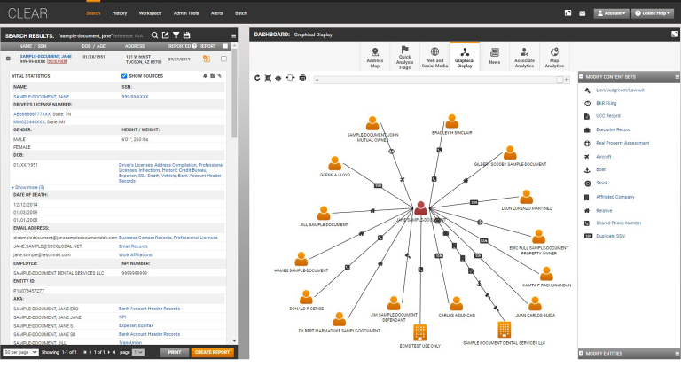 Thomson Reuters® CLEAR is powered by public and proprietary records and leverages cutting-edge public records technology to bring all key content together in a customizable dashboard. Locate hard-to-find information and quickly identify potential concerns associated with people and businesses to determine if further analysis is needed. The user-friendly platform was designed with intuitive navigation and simple filtering parameters, so you can quickly search across thousands of data sets and get accurate results in less time.